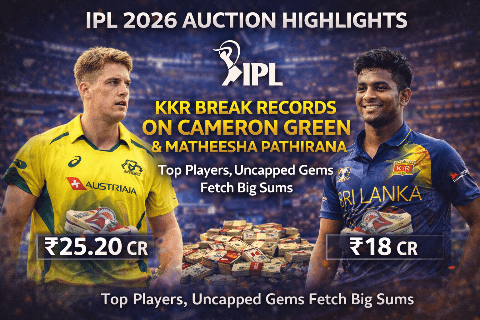 The IPL 2026 mega auction delivered high drama and record-breaking deals, with Kolkata Knight Riders (KKR) emerging as one of the biggest spenders of the day. The franchise stunned everyone by securing Australian all-rounder Cameron Green for a massive ₹25.20 crore and Sri Lankan fast bowler Matheesha Pathirana for ₹18 crore.